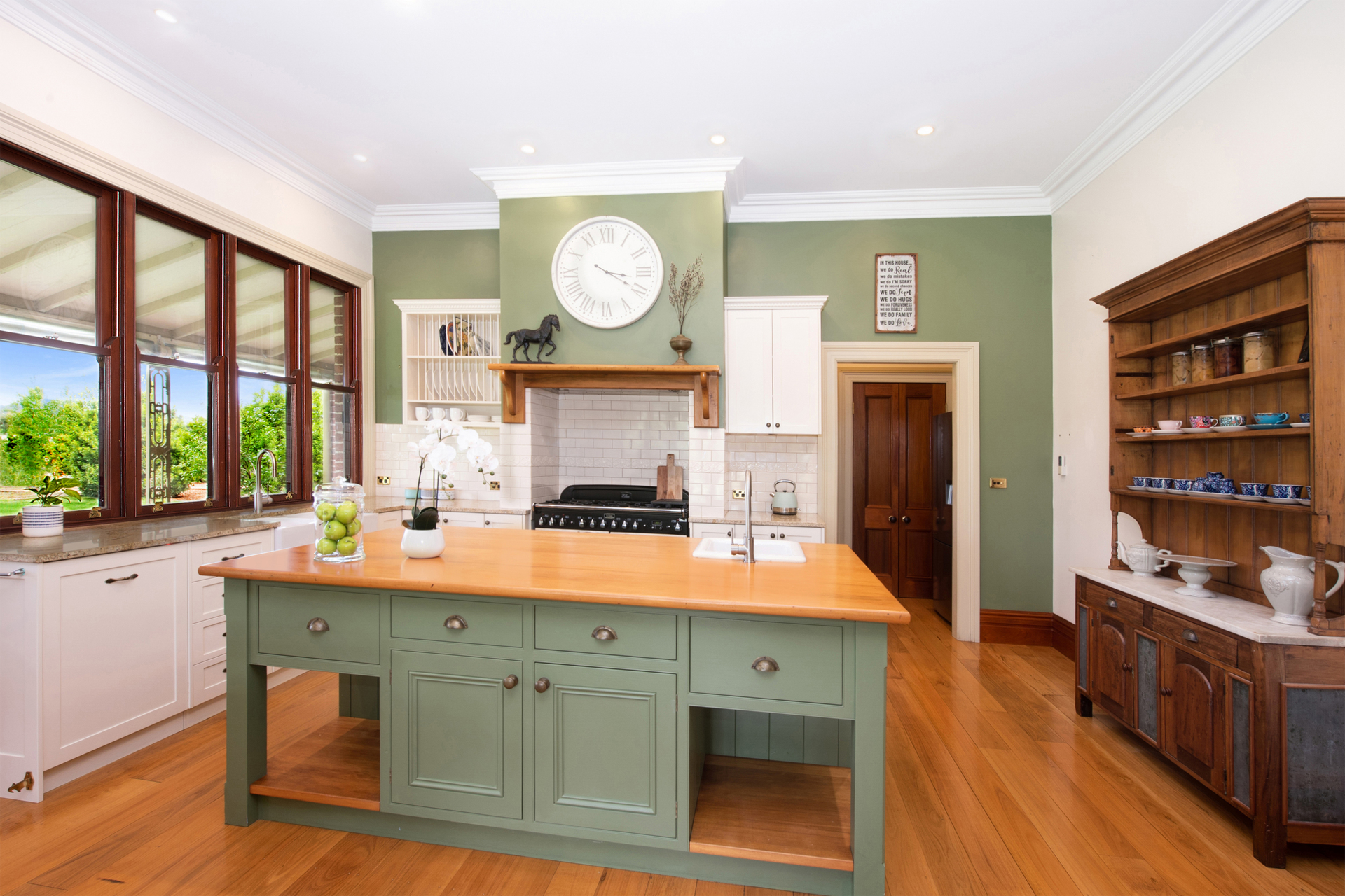 The kitchen is the obvious heart of the home, with its country-style handcrafted NZ kauri island bench, porcelain sinks, butlers pantry and huge Falcon gas cooker with electric oven, the envy of any proud chef.