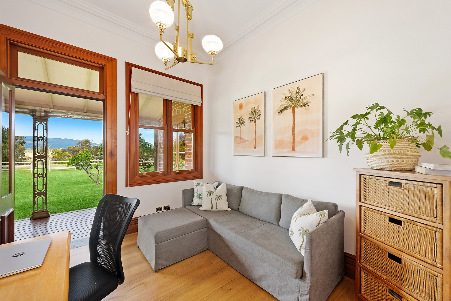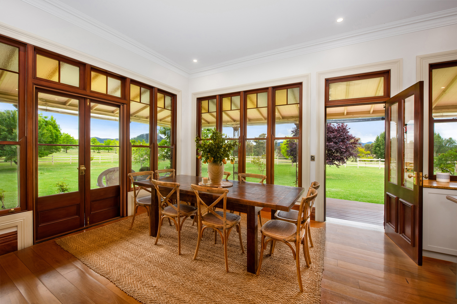Framed by tall windows, the adjacent family room is bathed in an abundance of natural light and looks out to the sprawling grounds. Doors lead to the shady veranda where enjoying meals or drinks al fresco is a wonderful option.