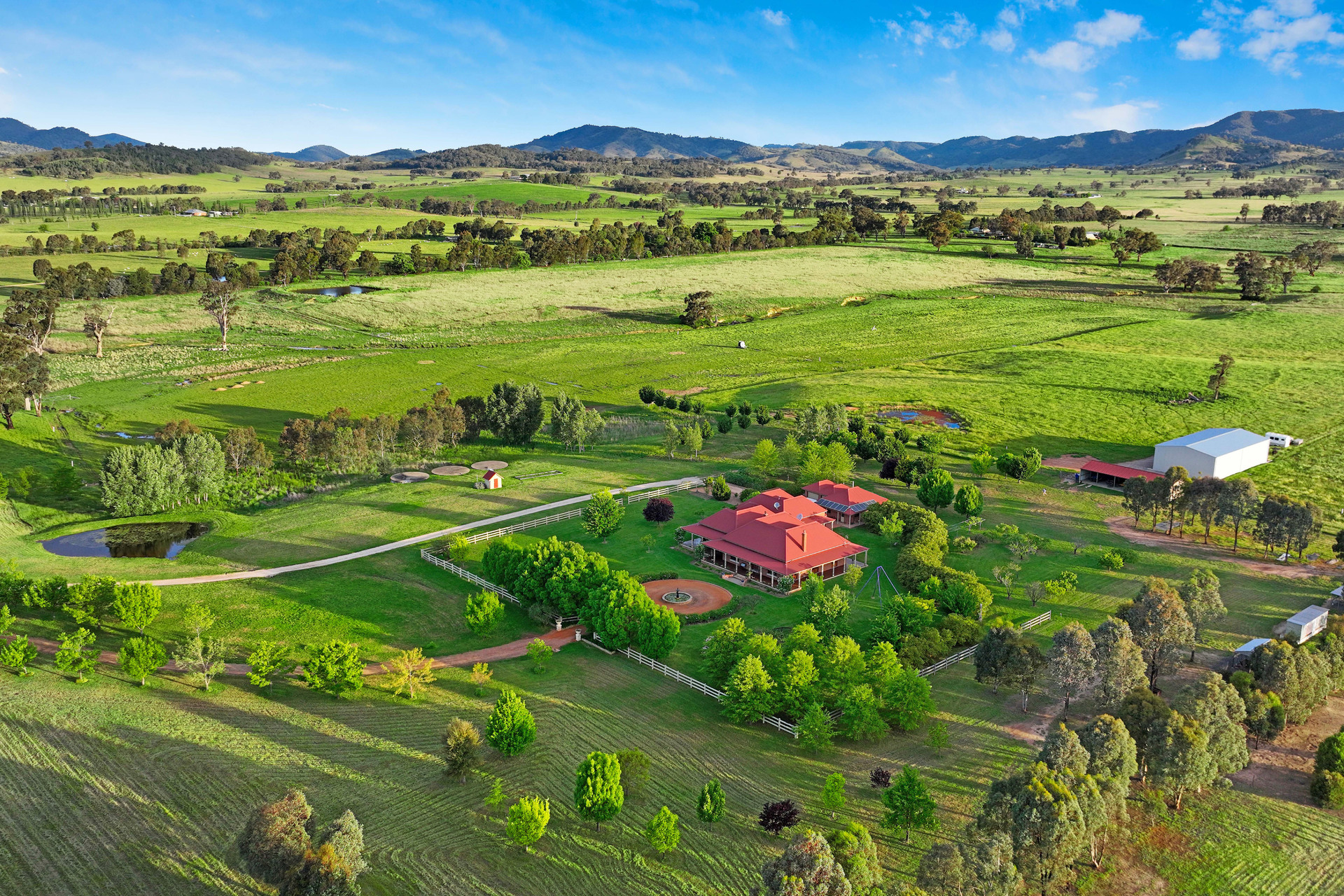 • Main bedroom has ensuite and dressing room • 11ft ceilings, wraparound verandas, marble fireplaces • Ducted air-conditioning, ceiling fans, wood heater • In-floor heating in bathrooms, claw foot bath, mud-room, laundry • Solar panels back to the grid, 3 phase power • 24m x 13m x 5.5m high machinery/hay shed • 18m x 7.8m, 5-bay equipment shed • Double garage with workshop and full bathroom • High-flow bore with 56 megalitre irrigation licence • Magnificent established garden, including orchard